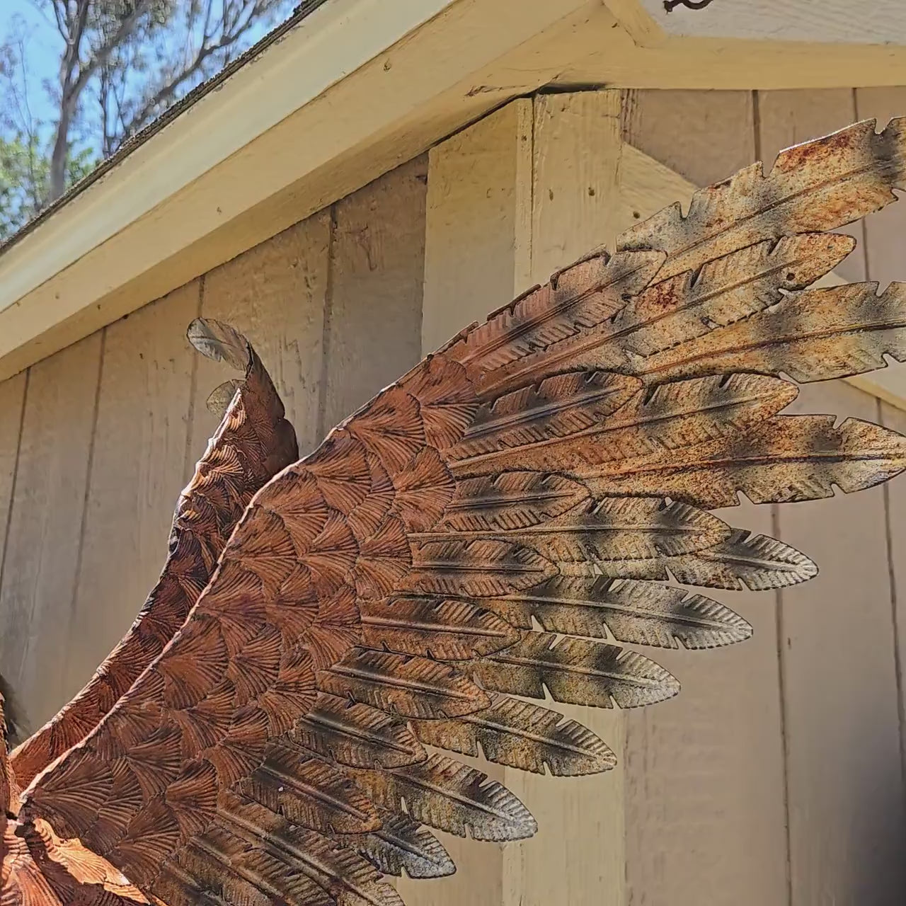 This handcrafted owl wall sculpture brings a bold artistic presence to your outdoor space. With wings fully extended and head turned alertly, this majestic bird is individually hand-welded and painted