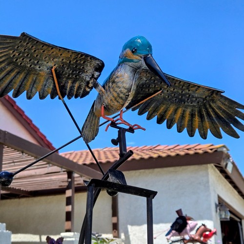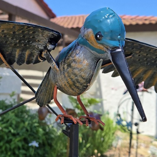 Size: 21X13.25X52.25"H blue hummingbird Made from Lightweight Steel Beautifully detailed Wings move up and down to give the flying effect Ground Spike and Cradle included Easy to assemble Counterweight makes the pig swing back and forth in the breeze